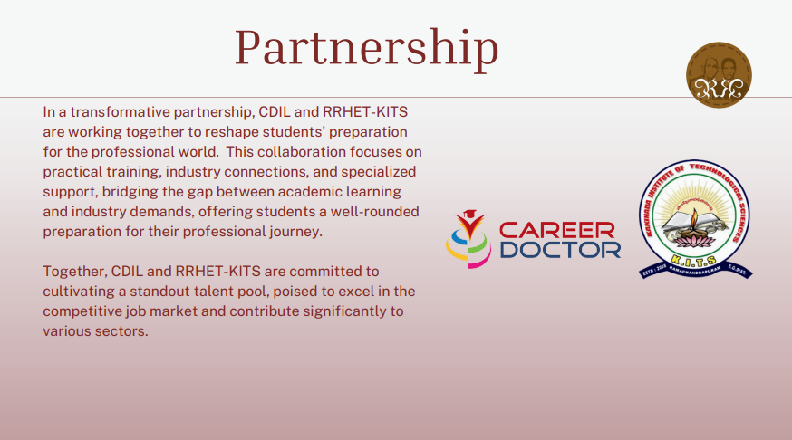 In a transformative partnership, CDIL and RRHET-KITS are working together to reshape students preparation for thr professional world. This collaborations focuses on practial traing, industry connection, and specialized support, bridging the gap between academic learning and industry demands, offering studentsa well-rounded preparation for their professional journeys