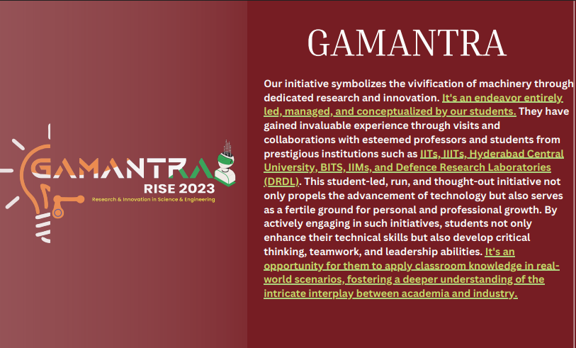 Our initiative symbolizes the vivification of machinery through dedicated research and innovation. It's an endeavor entirely led, managed, and conceptualized by our students. They have gained invaluable experience through visits and collaborations with esteemed professors and students from prestigious institutions such as IITs, IIITs, Hyderabad Central University, BITS, IIMs, and Defence Research Laboratories (DRDL).