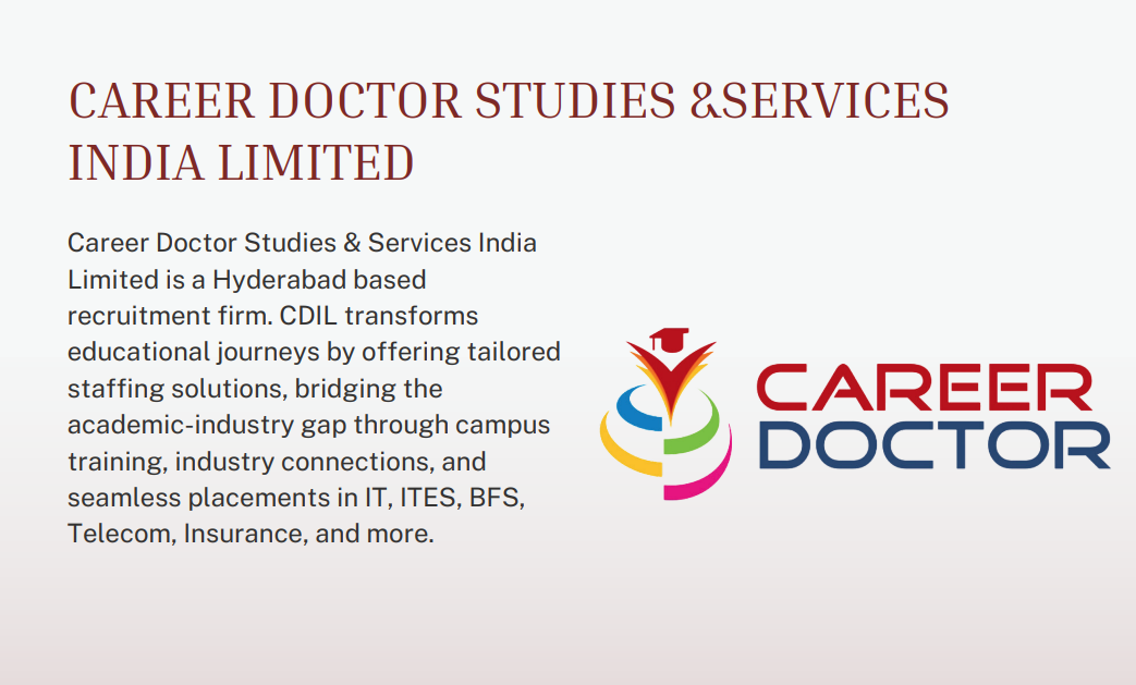 Career Doctor Studies & Services India Limited is a Hyderabad based recruitment firm. CDIL transforms education journeys by offering tailored staffing solutions, bridging the academic-industry connections, and seamless placements in IT,ITES BFS Telecom, Insurance and more..